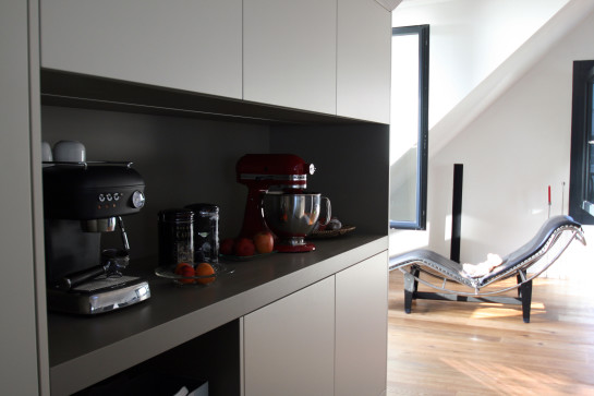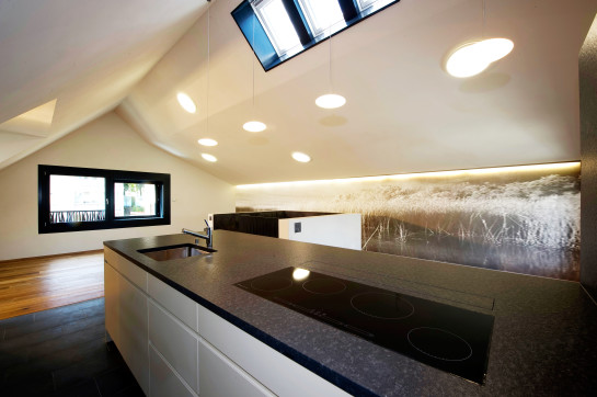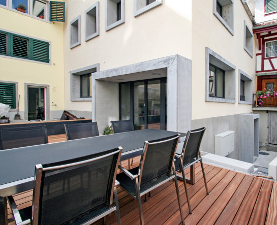 das wohnzimmer unter dem dach bietet see- und aussicht, die schlafräume darunter orientieren sich auf einen der raren grünen höfe der altstadt.