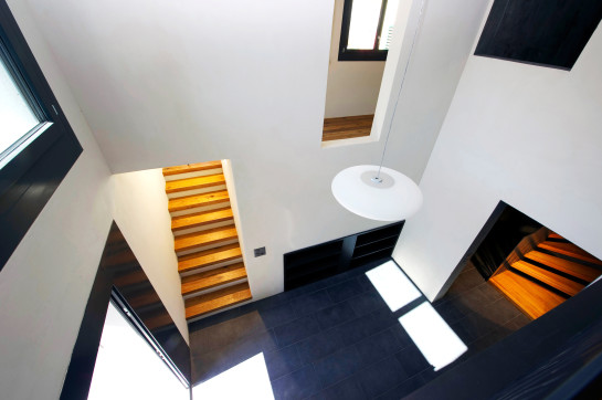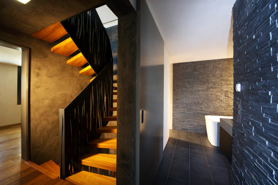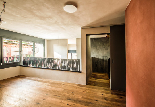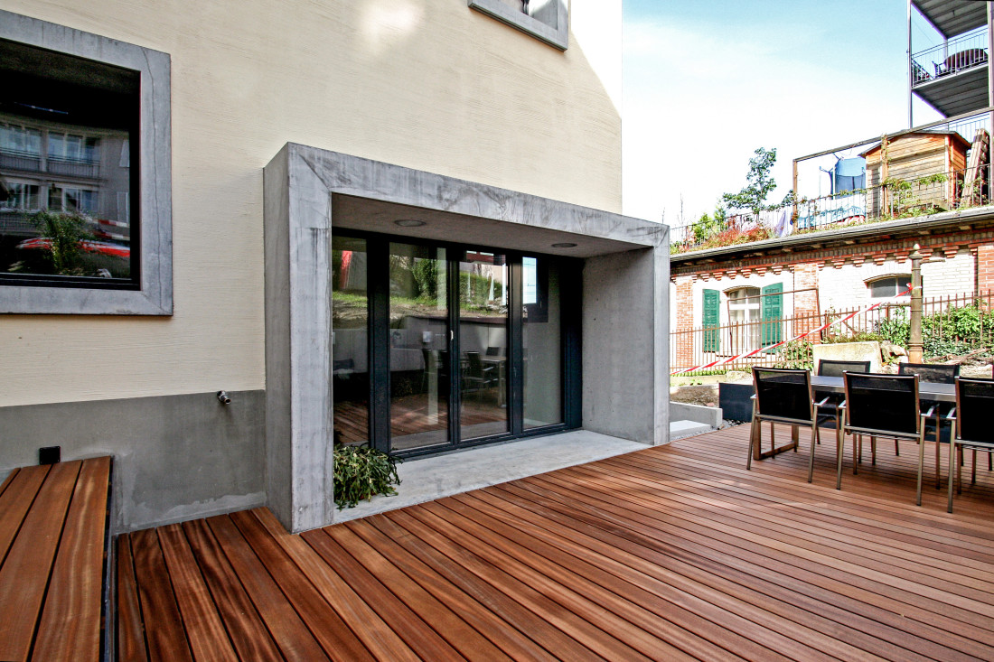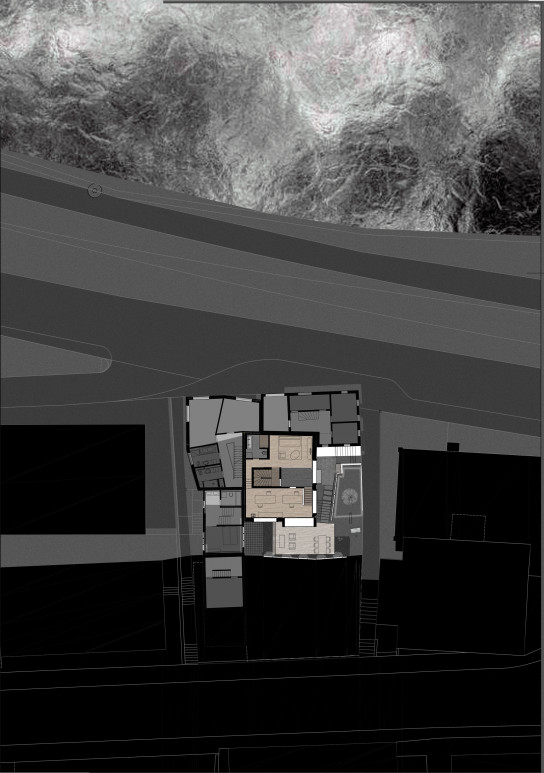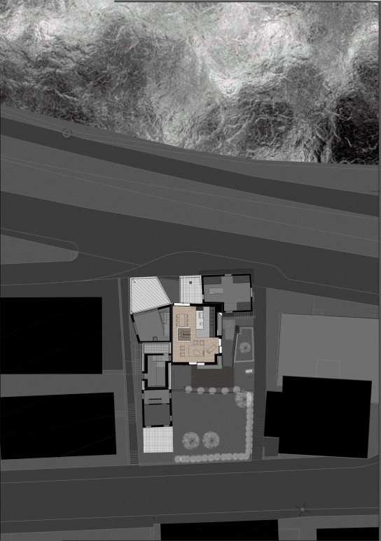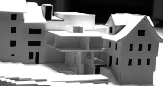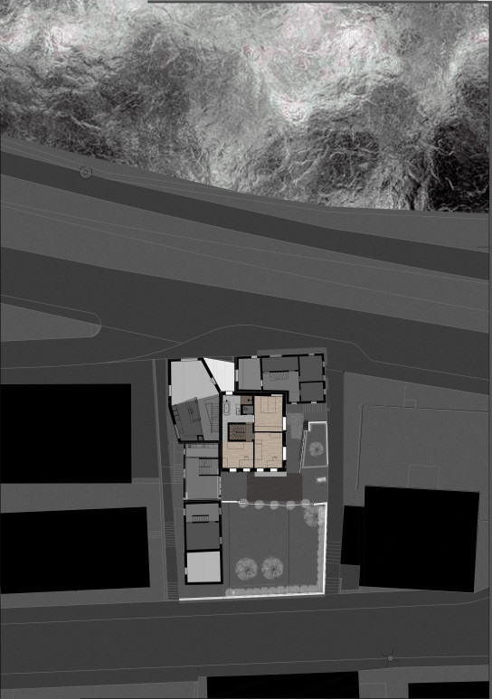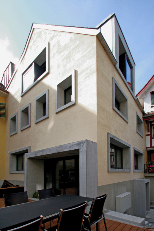 2004, in horgen brennen vier bedeutende altstadthäuser. drei häuser sind bis 2010 neu erbaut. vom ältesten bau des gevierts, dem 1703 erbauten winzerhaus auf der letzten parzelle, sind nur bruchsteinwände des kellers geblieben. alte stiche, fotos des brandes und der brandruine helfen uns, die identität des ortes zu analysieren. wir übernehmen die prägenden elemente in unseren entwurf und interpretieren sie modern; sockelputz roh, monolithische betongewände, einsteinmauerwerk verputzt mit horizontalem besenstrich, schindeldach mit schleppe und gaube.