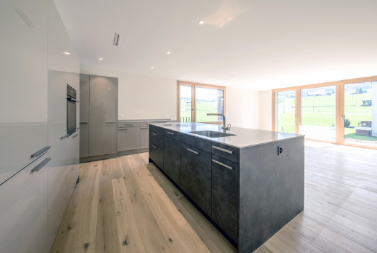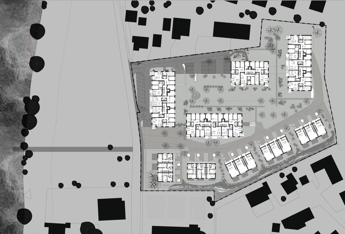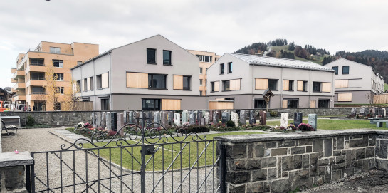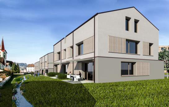 die einfamilienhäuser sind klassisch dreiteilig mit sockel, mittelteil und dach gestaltet. sie sind mit traditionellem sockelputz und horizontalem besenstrich verputzt. die schiebeläden und die kleinen schöpfe aus fichte schaffen einen bezug zu den neuen mehrfamilienhäusern im norden.