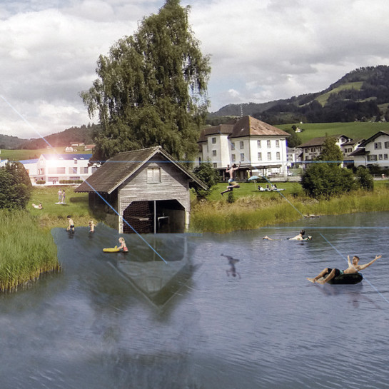 ein zwischen den reihenhäusern und der kirche verlaufender bach wird freigelegt und in sein natürliches bett gelegt. dieser mündet ennet der strasse in den sihlsee, wo für die bewohnern ein kleiner badeplatz eingerichtet wird.
