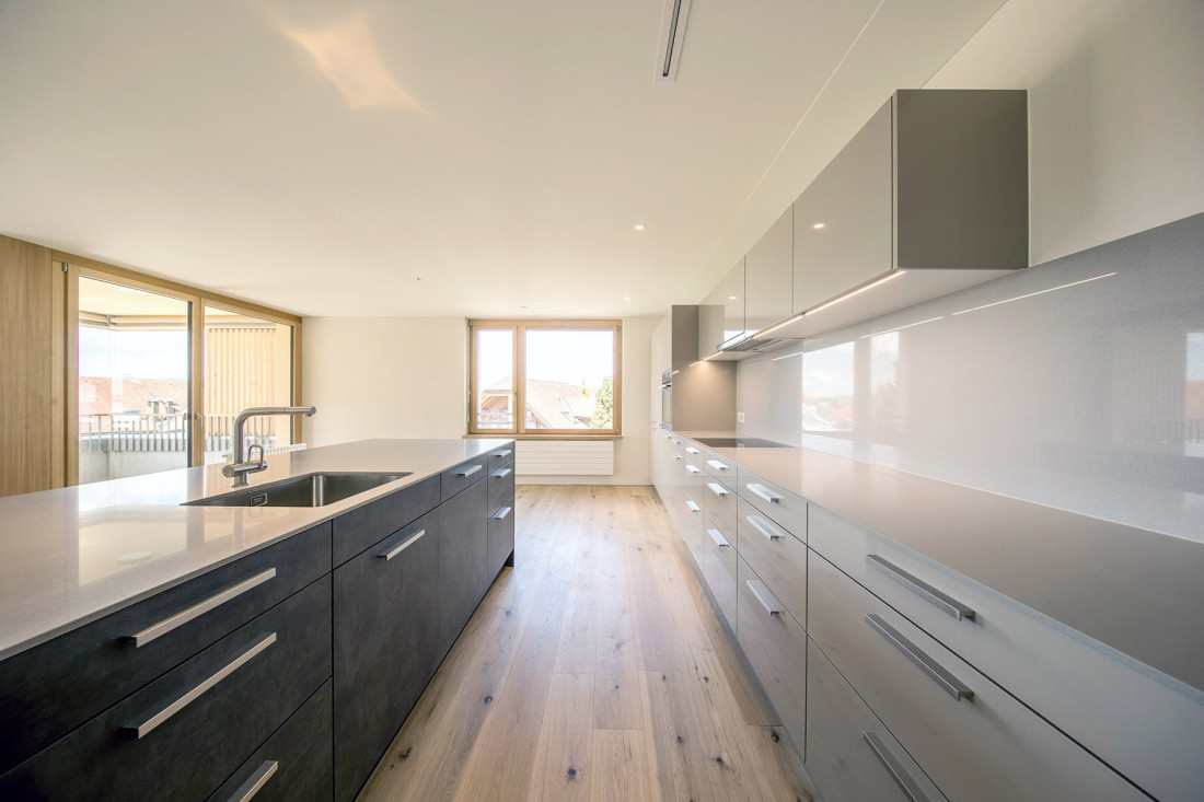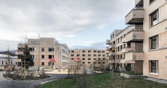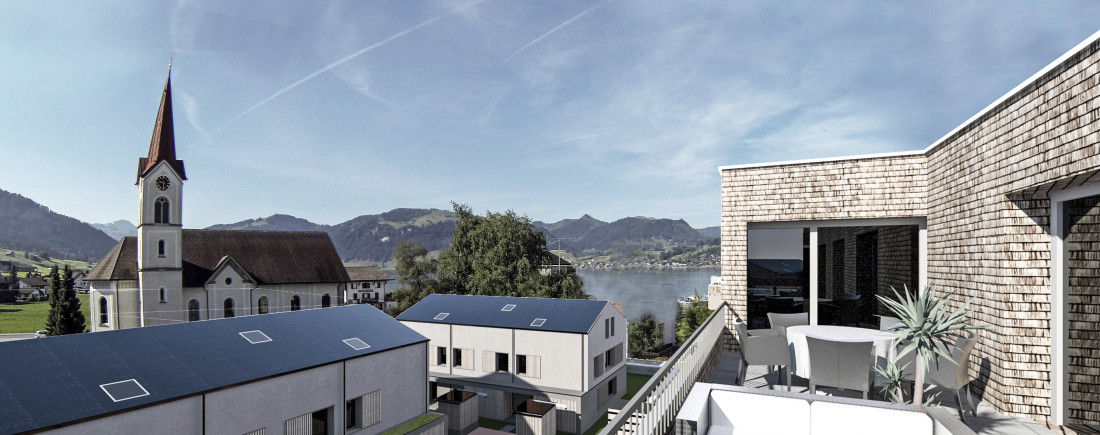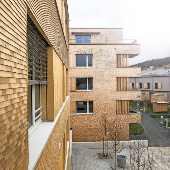 vier mit fichtenschindeln bekleidete mehrfamilienhäuser gruppieren sich im norden der parzelle um einen grünen hof. zur kirche im süden der parzelle begleiten 15 mural gestaltete reihenhäuser einen kleinen bach. die kleinmassstäblichen häuser wahren die silhouette des ortes und betonen die kirche als wichtigsten bau willerzells. in der nahtstelle zwischen den beiden beiden typologien führt eine wohnstrasse vom neu gestalteten dorfplatz an der hauptstrasse zum am östlichen siedlungsrand gelegenen spielplatz.