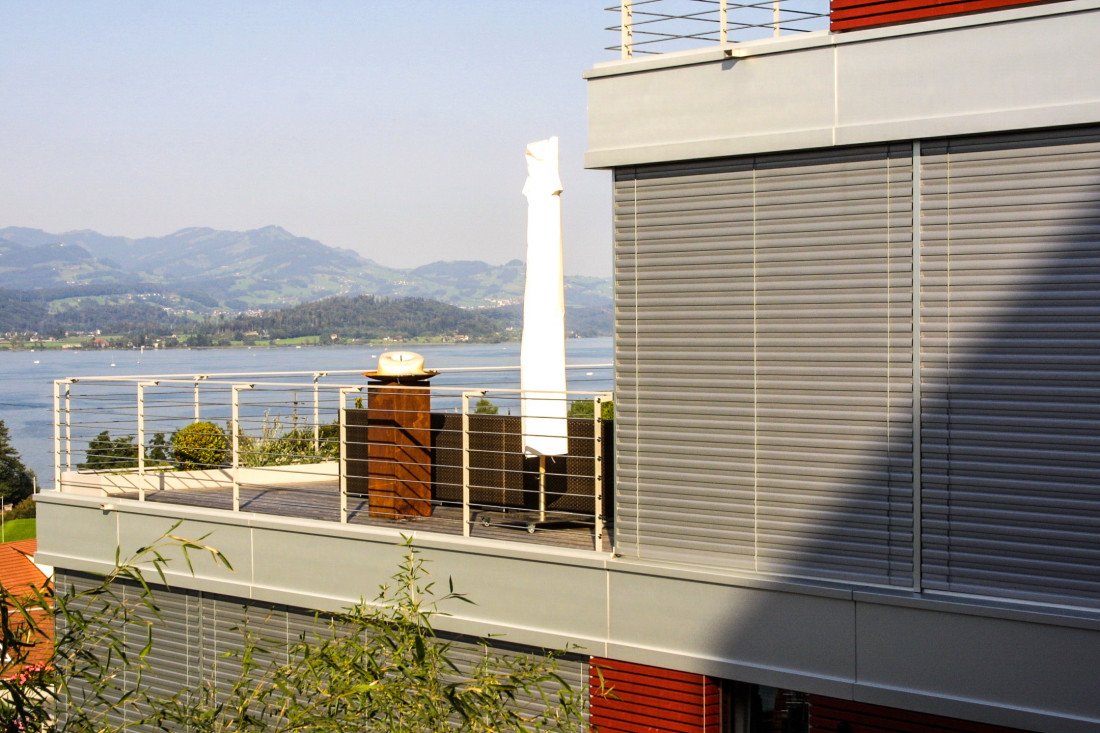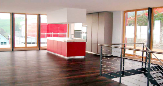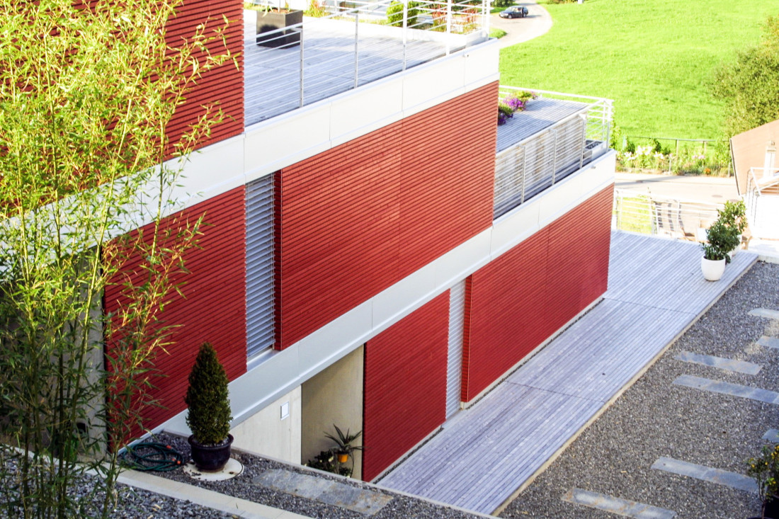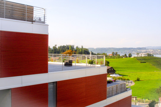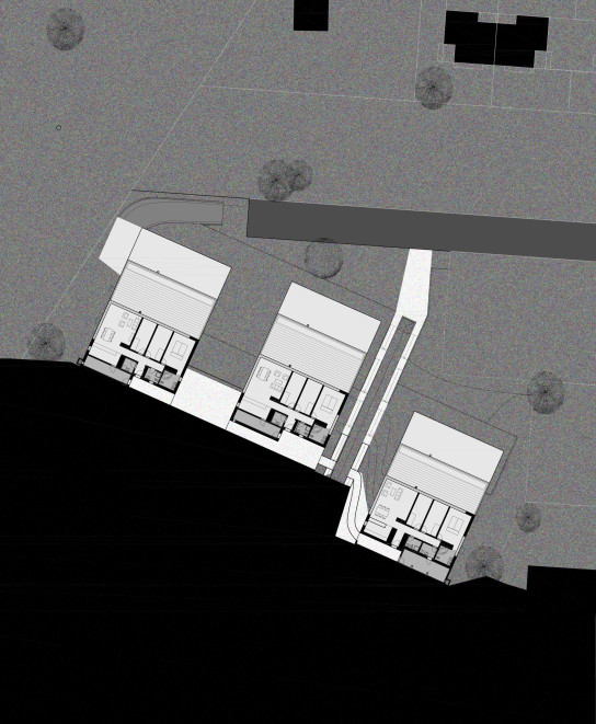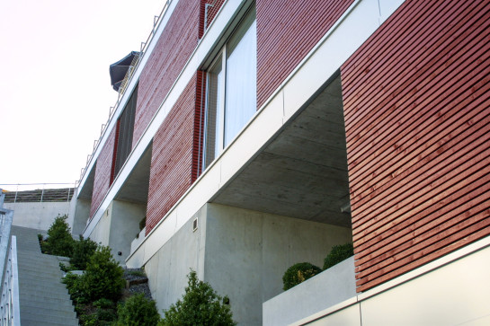 drei horizontal gegliederte terrassenhäuser platzieren wir sanft in den zum obersee hin abfallenden nordhang. die holzschalung in einem warmen rot-ton macht die siedlung zu einem guten orientierungspunkt in einem ansonsten diffusen umfeld. die farbe steht komplementär zum grün der landschaft, sie unterstützt die harmonische einbettung in die Umgebung.
