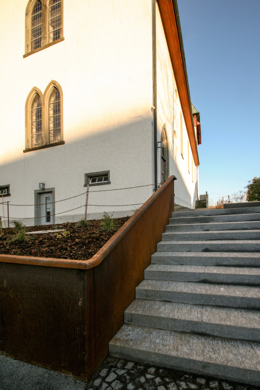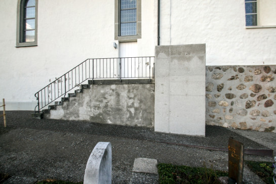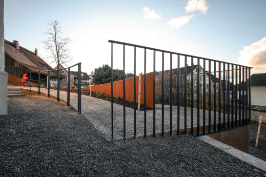 neu verbindet eine untere rampe das zugangsniveau mit der ebene des haupteinganges barrierefrei. diese rampe setzt einen modernen, architektonisch zeitgemässen akzent; sie setzt sich materiell ab und fügt sich farblich ein, ein neues ganzes entsteht.